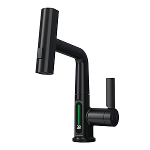 Modern Single Hole Basin Faucet with Waterfall, Pull Out Sprayer and LED Temperature Display, Black